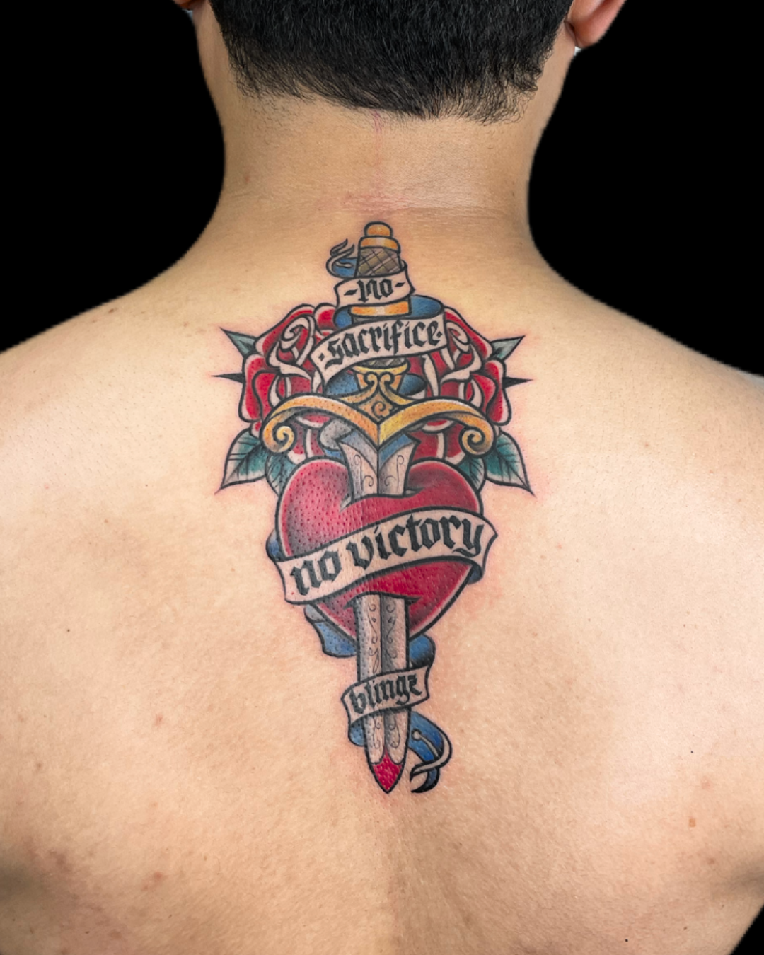 Bold outlines combined with vibrant colours — a mix of old-school tattoo heritage and modern artistic depth.