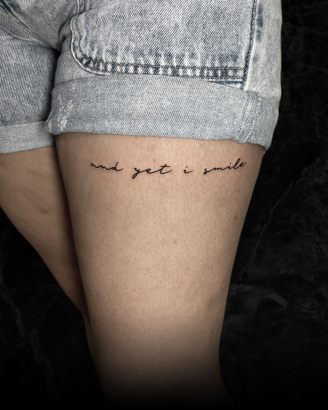 Single words, initials, short quotes, affirmations, or symbolic dates in beautiful micro fonts.