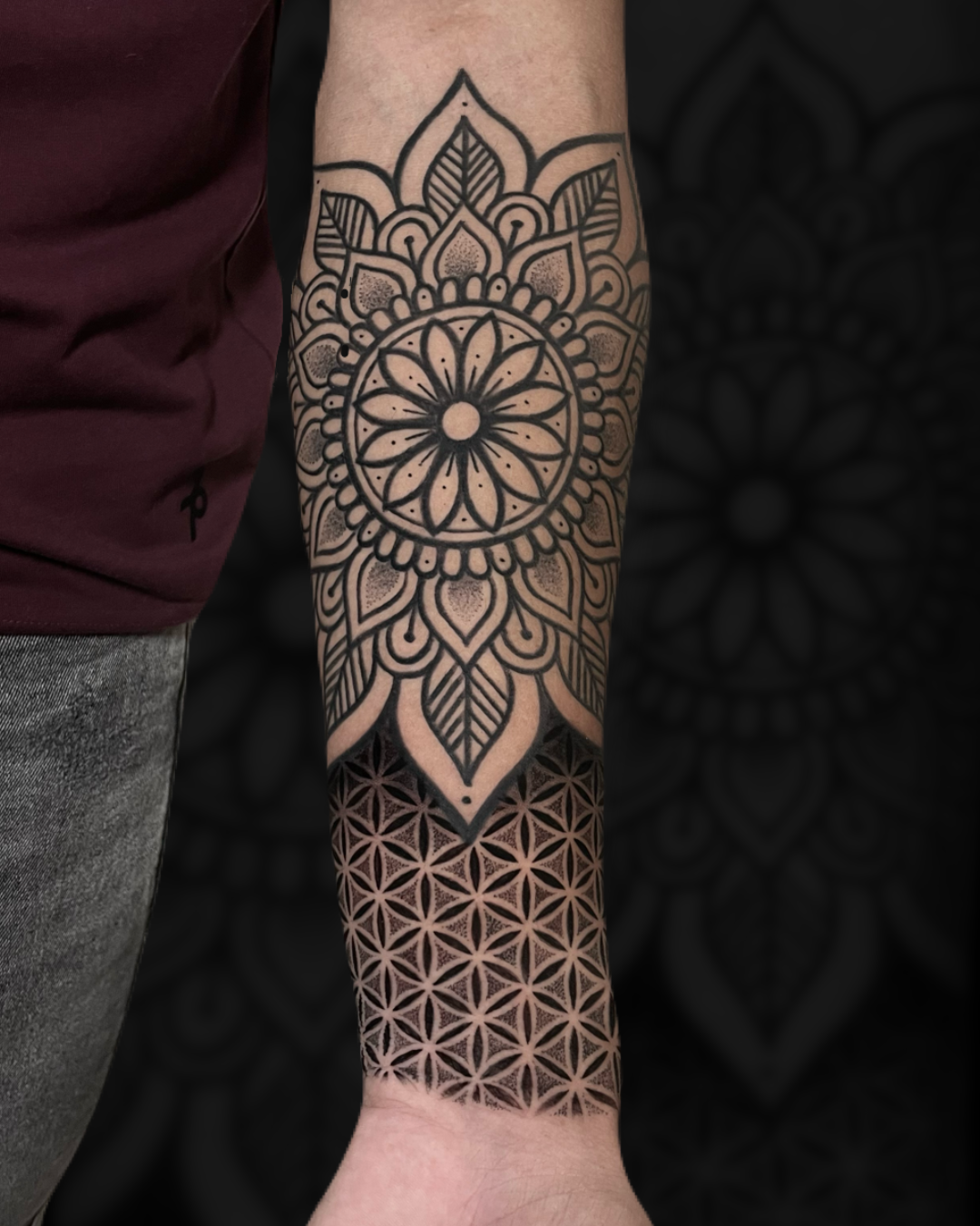 Full arm compositions blending mandalas, patterns, lines, and dotwork for a stunning continuous flow.