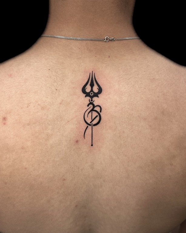 This sacred mantra tattoo symbolizes devotion, peace, and inner awakening. It can be combined with minimal Shiva elements, Trishul symbols, or fine-line detailing.