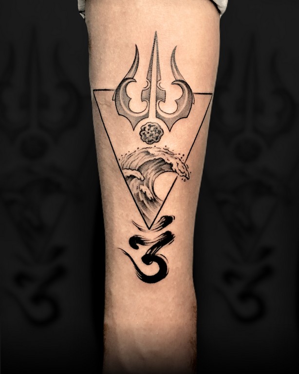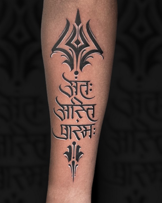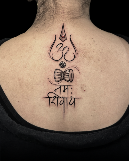 This sacred mantra tattoo symbolizes devotion, peace, and inner awakening. It can be combined with minimal Shiva elements, Trishul symbols, or fine-line detailing.