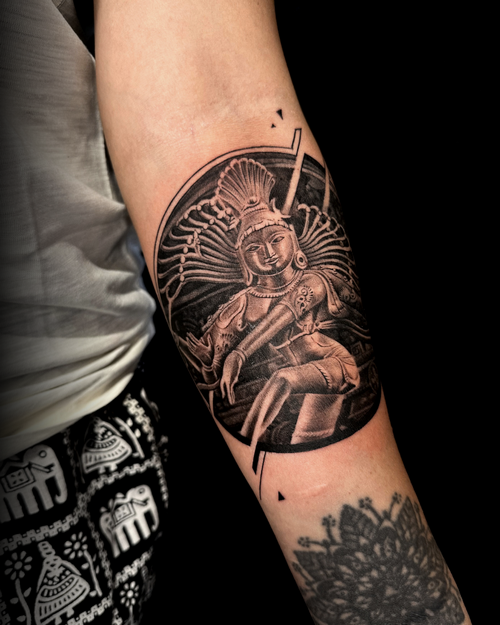 Tandav represents cosmic dance, energy, and transformation. It’s a powerful tattoo style often chosen by people who resonate with strength, passion, and movement.